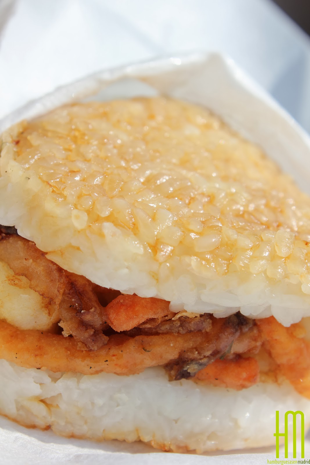MOS rice burger Kaisen-Kakiage con verduras y gambas fritas. Como imaginaréis, esto se sale de nuestra valoración habitual hamburguesera, pero ya sólo por la originalidad, a nosotros nos conquistó. Además, viene envuelta en un tipo de papel especial que hace que no se deshaga ¡aquí está todo pensado!
