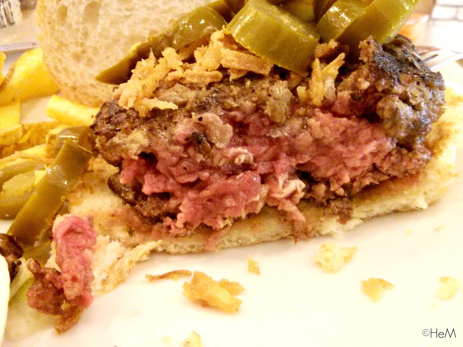 En cuanto al panecillo, a pesar de estar de estar ligeramente tostado, no aguanta los jugos de la carne y el resto de salsas, por lo que también se desmorona a la primera de cambio. Estas cosas, junto al detalle de la carne poco compacta, hace que nos acabemos encontrando con un puzzle en nuestro plato al poco tiempo de empezar.