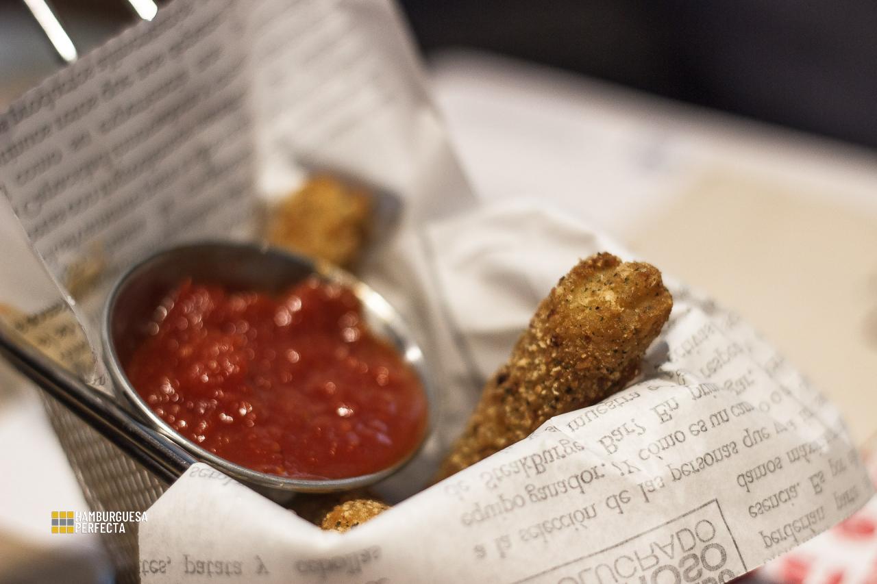 Como ya estábamos más que familiarizados con la oferta hamburguesera, fuimos directos al lío, pasando antes por unos mozzarella sticks para ir haciendo hambre, que nos vinieron en forma de dos medias raciones, ya que hubo una confusión que condujo a su consiguiente reclamación y que achacamos a la gran cantidad de clientes.