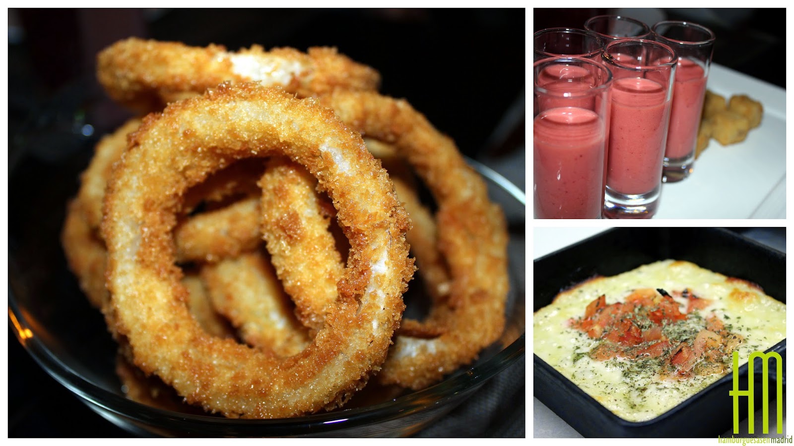 Para calentar motores y que se nos quitasen los nervios por tan magno acontecimiento, comenzamos con unos chupitos de fresa, realmente curiosos, refrescantes y que sorprenderán a más de uno, acompañados por unas croquetas caseras y EL ENTRANTE, la provoleta, bien fundida, con los bordes súper crunchy y servida directamente del horno; su sabor, indescriptible. Sin olvidarnos de los aros de cebolla, con un rebozado muy fino, al estilo japonés, según nos contaron y muy sabrosos.