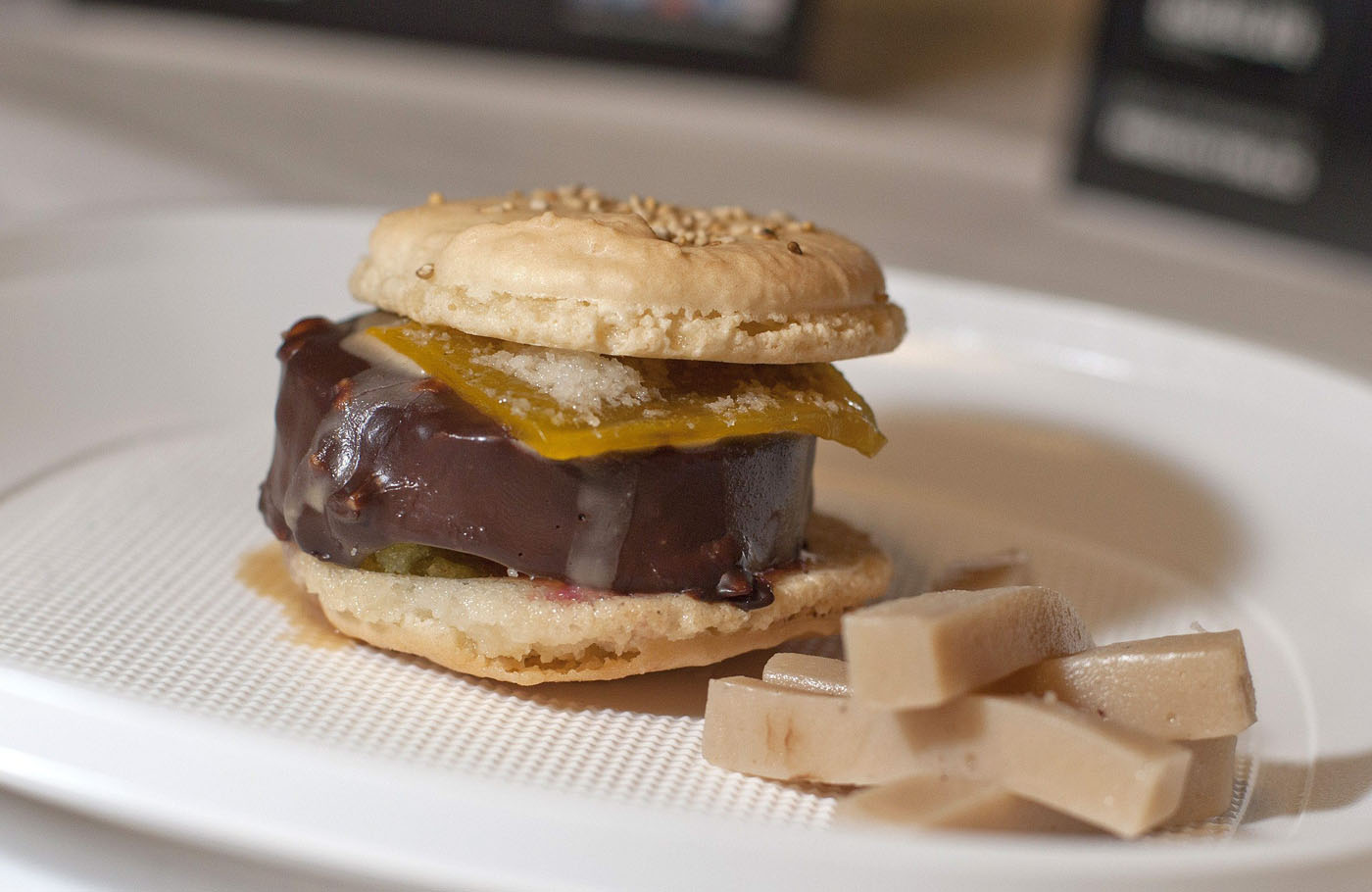 En palabras de su autor: “La creación de una hamburguesa de chocolate nace como un reto que nos planteamos, como una manera de desmentir la barrera que separa a los cocineros de quienes nos dedicamos al mundo de la repostería. Pese a lo que pueda parecer, desde lo dulce también se puede innovar en alimentos tradicionalmente salados… y aquí está la prueba”.