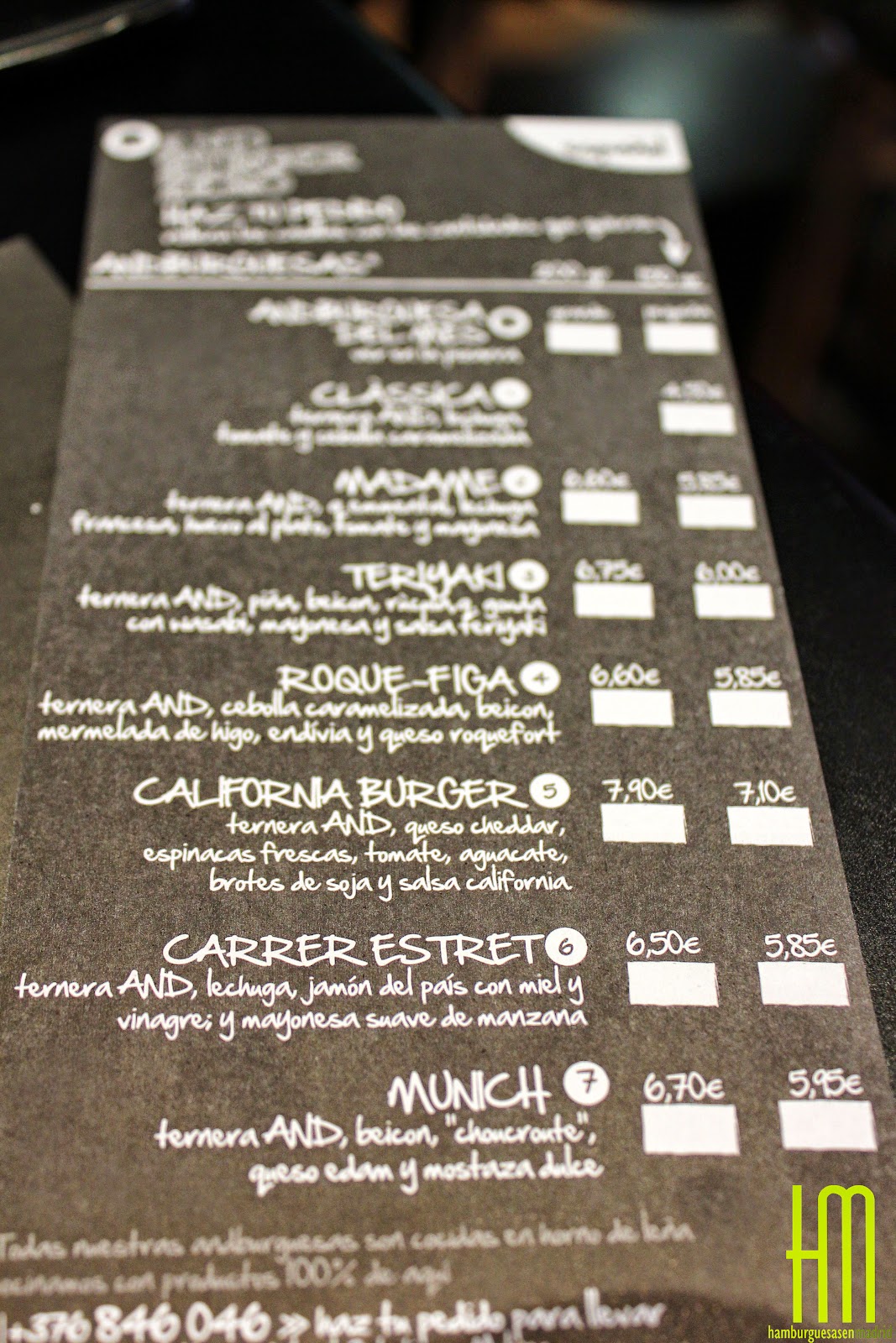 Pero vamos a lo que vamos: comer. Echando un ojo a la carta vemos que las cosas no han cambiado demasiado: unos cuantos entrantes, ensaladas y las esperadas hamburguesas. Una selección de ocho burgers que varía en cada uno de los locales -cosa que nos parece estupenda- y que se puede elegir en dos tamaños, 150 y 200 gramos. Los precios siguen siendo tremendos, la hamburguesa más cara no supera los 8€, así que ¿qué más podríamos pedir?