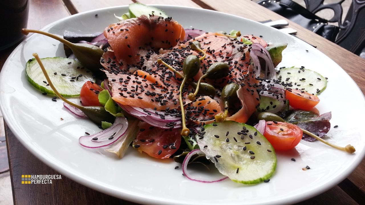 La ensalada estaba bastante buena, con todos sus ingredientes en su correcta medida, sabor y frescura. A destacar las alcaparras que, junto con el salmón y su salsa, hacían una combinación agridulce. El salmón bastante fresco y hay que decir que en una cantidad realmente abundante, cosa poco frecuente porque siempre tienden a recortar en este ingrediente. El plato en general era grande y venía cargado de verde, por lo que se nos antoja como una elección agradable para empezar o para esos estómagos a los que les gusta comer algo más ligero.