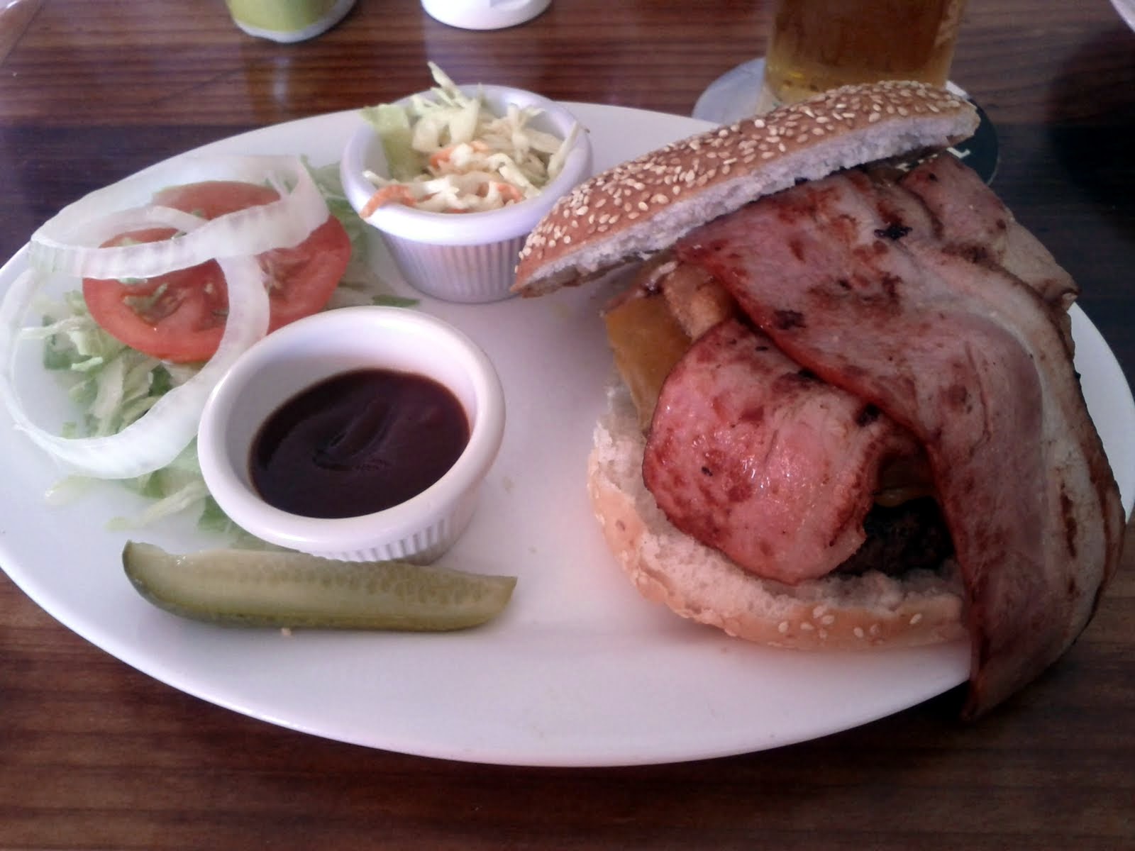 La hamburguesa de la imagen corresponde al ya desaparecido Hooters de la Playa del Inglés, Gran Canaria. Un local pequeño, pero acogedor y en el que se puede disfrutar de hamburguesas como ésta. La carne es de un muy buen sabor, bien cocinada y tratada, cosa que, a pesar de la fama, es muy difícil de encontrar en una gran franquicia. Los ingredientes que acompañan a la carne cumplen a la perfección, si bien el bacon podría estar poco hecho, pero es un detalle pequeño.