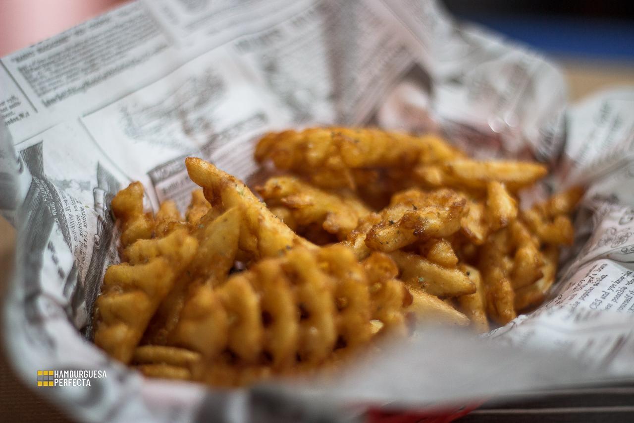 A falta de entrantes o acopañamientos, nos animamos con unas patatas fritas y aquí sí que encontramos algo que no nos gusta. Congeladas y un poco aceitosas, tenemos una especie de cuadrícula que puede ser muy vistosa e incluso gustarle a los niños, pero que hace desmerecer un poco la sensación de calidad. Y encima duele más cuando la ración no se puede compartir bien al ser de tamaño más bien individual.