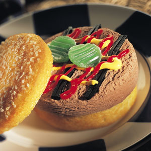 - Echar media taza de helado enlos cuatro panecillos de bizcocho abiertos, suavizando los bordes, para que parezca un auténtico trozo de carne. Pegar, presionando suavemente, los trozos de regaliz sobre el helado para conseguir unas buenas marcas de parrilla.