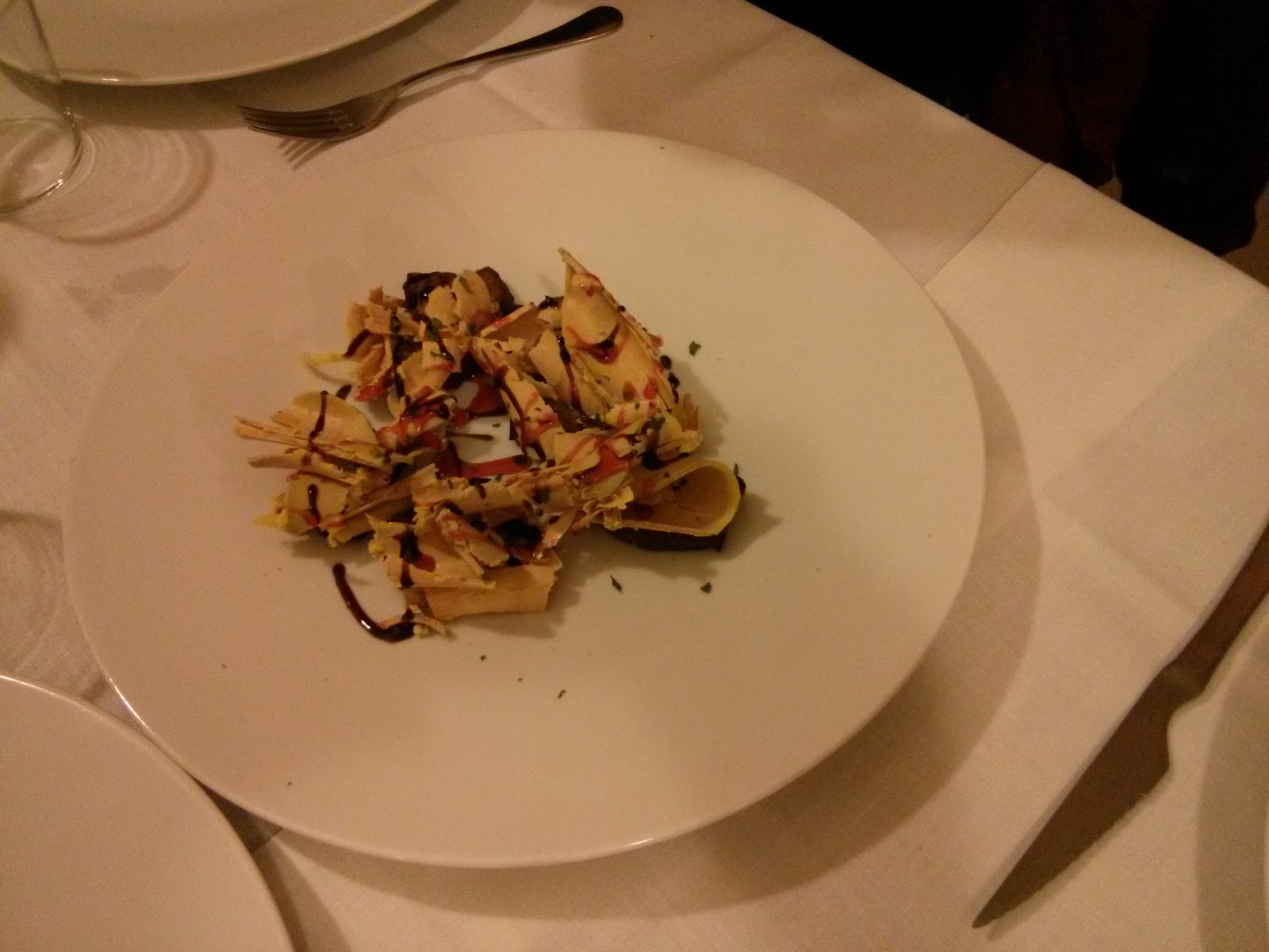 Al poco de sentarnos, llegó la primera degustación: un plato virutas de foie micuit sobre unas tostadas de pan negro. Sencillamente espectacular, muy suave y una gran elección para hacer hambre ante lo que se nos venía encima.