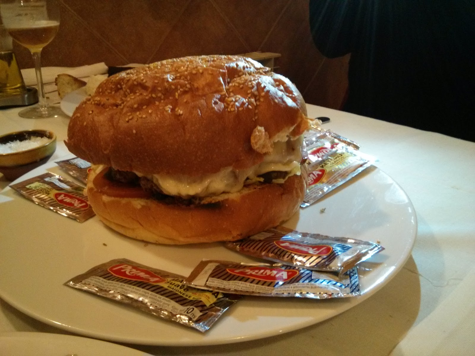 Llegados a este punto y con el comentario generalizado de la calidad de las carnes y el buen hacer del cocinero, llega el turno de nuestra protagonista. Una hamburguesa gigante, que no tuvimos más remedio que compartir, con todo el dolor de nuestro corazón.